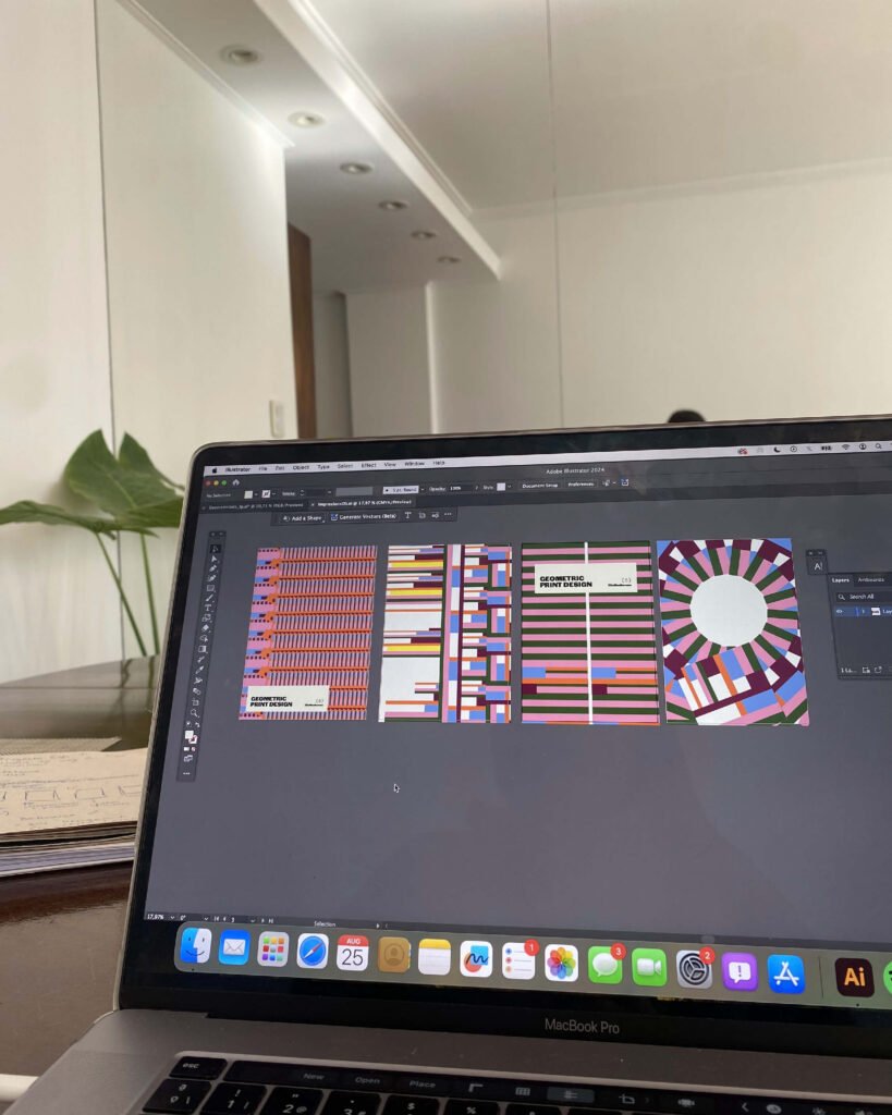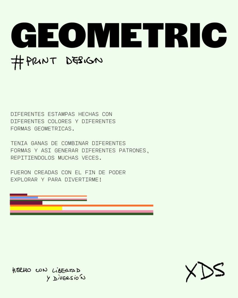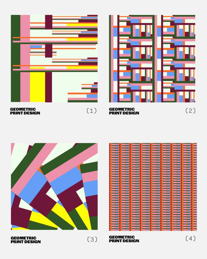 Propuestas de estampas geométricas digitales. Exploración de combinaciones cromáticas y formas.